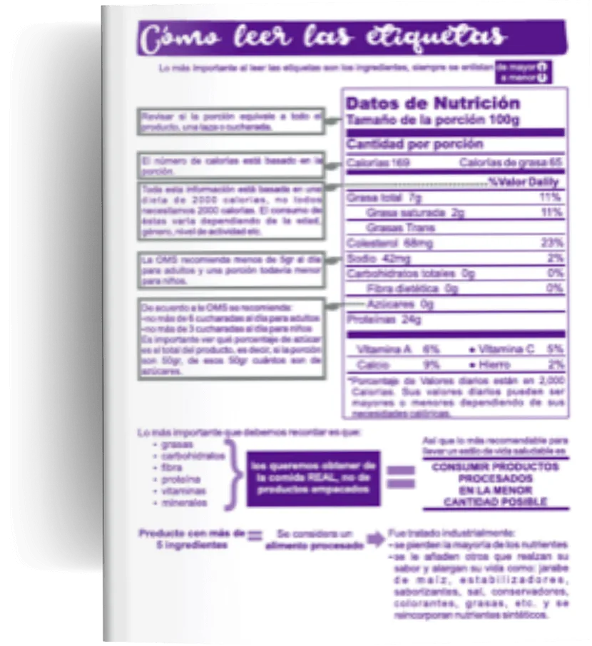 • Guía rápida para leer etiquetas: Enseña a identificar los ingredientes clave y a evitar aditivos no saludables.